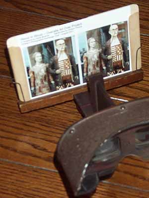 If you want to use digital stereoviews with a traditional Holmes stereoscope, you can do it one of two ways; with an adapter and with traditional Holmes stereoview cards.