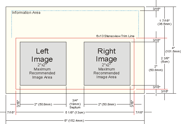 The left and right borders are the most critical specification in this standard. A 1/4 inch border on each side was chosen for two reasons. First, many digital photo processors enlarge the digital image to about 4 1/8 x 6 1/8 to assure that the image will bleed off the edge of the print. This feature is built into the basic processing of their machines. Second, if an adapter is used to hold unmounted prints, some room must be left to allow for a retaining lip or flange. It is important that this flange not interfere with the stereo window. A 1/4 inch border allows the print to be enlarged slightly and to be used with an adapter while maintaining the integrity of the stereo window that you have chosen.