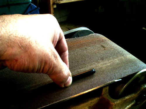 Now, we need to make a flat spot on the dowel for the cane to lie against. We use a horizontal belt sander with medium/fine grit cloth. Pinch the middle of the dowel with thumb and forefinger and push the piece decisively against the belt. Try not to sand your fingertips. Pull the piece off and check for results: if it’s sanding more toward one end, slide your fingers a short distance toward the other end and go again, making sure you set it onto the belt exactly evenly. This takes some practice. Stop when the flat spot is even from end to end and in far enough to just be “kissing” the reed seat.