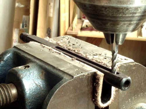 Next, we mill a slot. Use a milling machine or a drill press with an X-Y vise, and a spiral cutter. Center it on the flat and mill through to the bore, starting about 1/8” from the outside end and going about 3/4 of the way down the length of the flat. If you go very slowly the channel edges will not need cleaning up. If it is rough, clean up the inside edges with a small hook knife and the outside edges with 400 grit sandpaper. Finish-sand the flat with 400-600 grit sandpaper on a perfectly flat surface such as a piece of glass or the drill press table. Plug the outside end with glue and a leather “punching” or a small bit of dowel. Oil the reed bore and body. We use Watco® Danish Oil Finish.